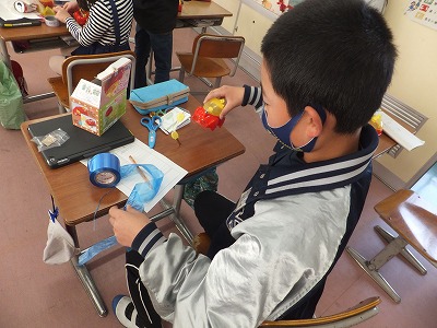 昨日作った装置を使って、電気を通すものをいろいろ調べました。みんな楽しそうに実験していました。