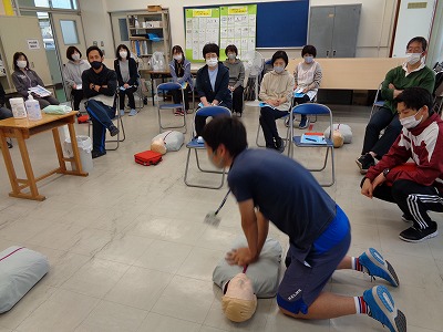 来月からの水泳指導に備えて、教職員が心肺蘇生法の研修会を行いました。