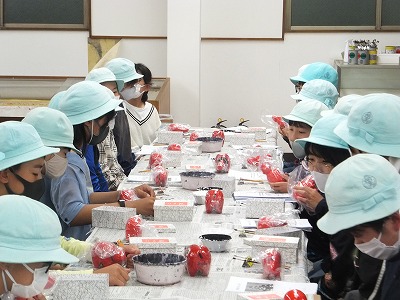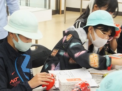 見学に来た3年生には、6年生が説明しています。