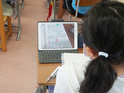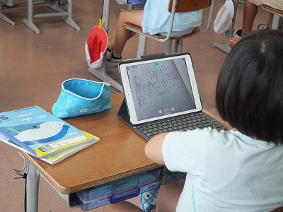 子供たちは、自分のノートを撮影して先生に提出しています。
