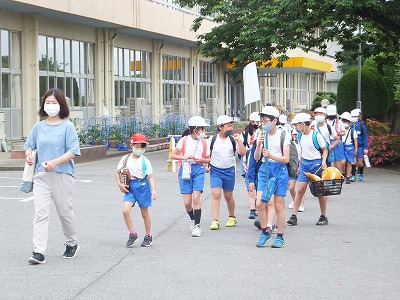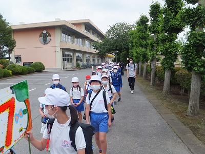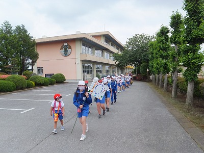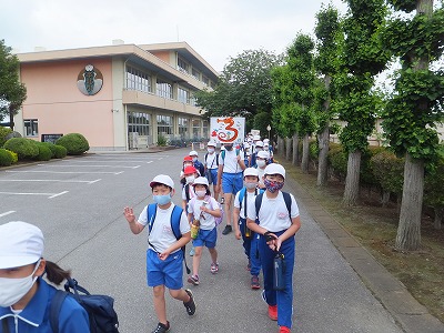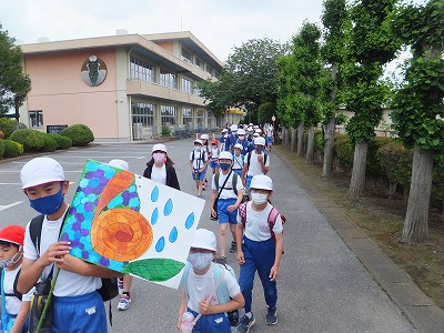 班長さんが手作りの旗を持って、低学年と高学年がペアになって歩きます。