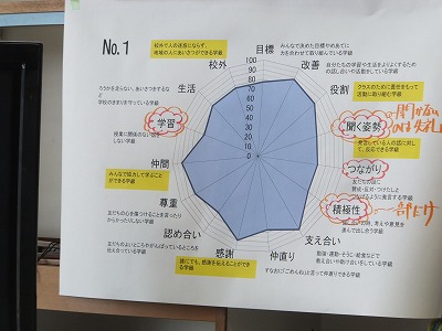 学習・聞く姿勢・つながり・積極性に課題があるようです。クラスのみんなで、一つ一つを高めて、より良い学級にしていきましょう。