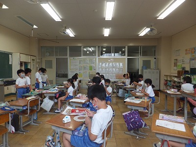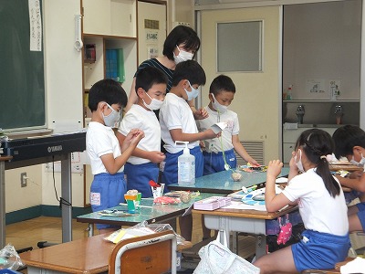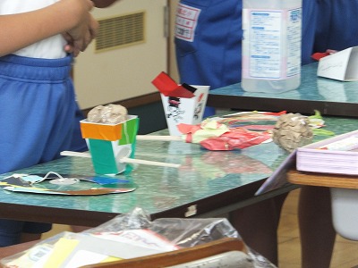 今日は、図工の時間に作った紙けん玉をみんなに紹介しました。