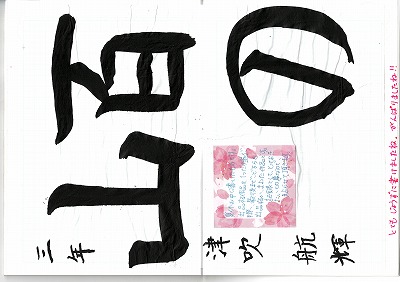 何回も練習を重ねた習字の一枚を自学ノートに貼ってありました。「山」の字が特に上手ですね。
