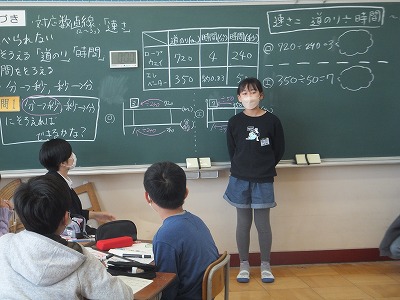 道のりはmが単位でそろっているものの、時間は秒と分で単位が違います。どうやって速さを比べればよいかを考えます。