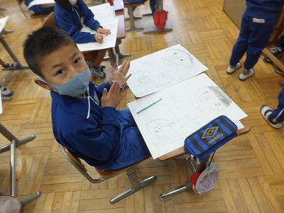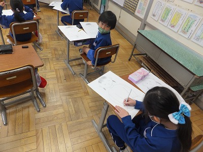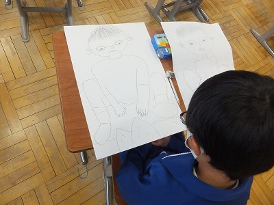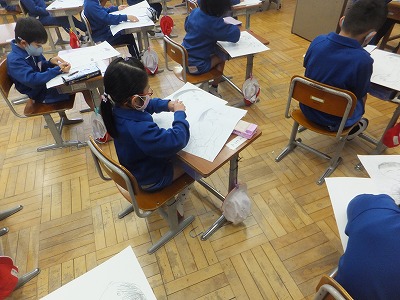 みんな形をしっかりとらえて、大きく描くことができています。上手ですね。次は色を塗ります。最後まで頑張りましょう。