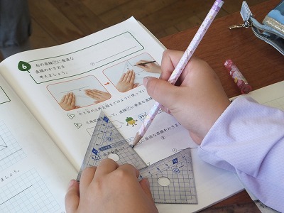 点を中心に、図形の拡大図や縮図をかく練習をしています。