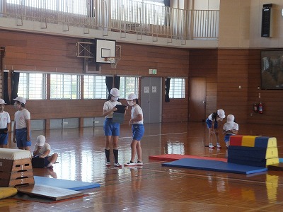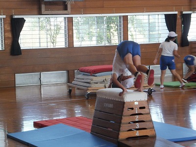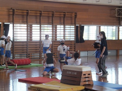体育では、台上前転の練習をしています。できている人は、よりきれいにできるように形にこだわるように指導しています。