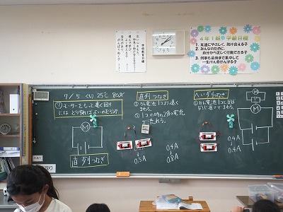 理科の時間に電池のつなぎ方とモーターの回り方や電球の明るさについての実験をしました。