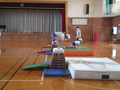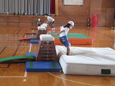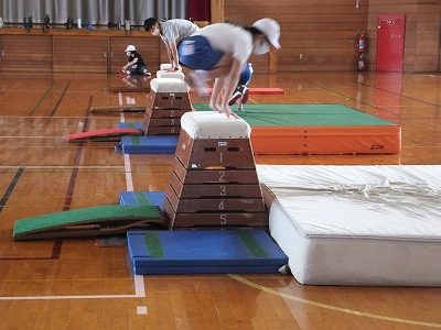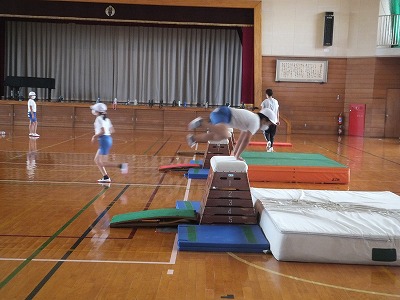 今日の体育は、閉脚飛びの練習です。