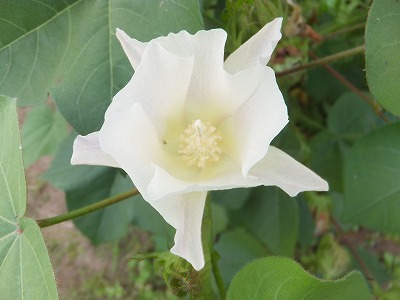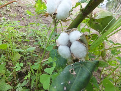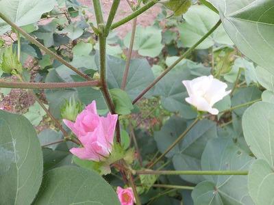 農園では、綿花がきれいに咲いています。1本の綿に白とピンクの花が咲いています。既に、たくさんの実をつけています。実がはじけて、中から綿が顔をのぞかせていました。