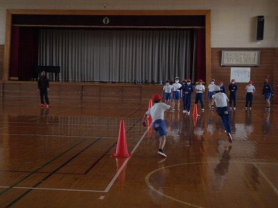 グランドコンディションが良くなかったので、体育館でリレーをしました。