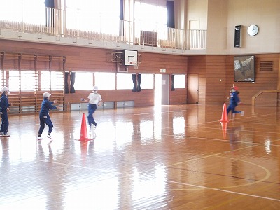 体育館で追いかけっこをやりました。リレー形式で、敵のチームを追いかけます。