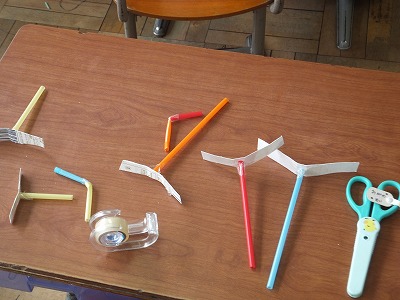 出来上がった紙トンボです。結構よく飛びます。他にもいろいろなおもちゃを作っていました。1年生に喜んでもらえるといいですね。