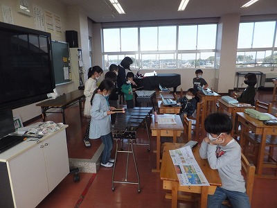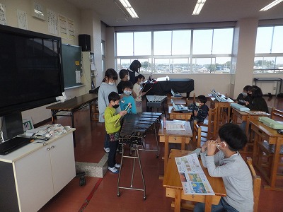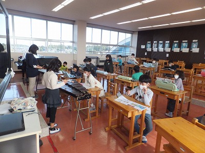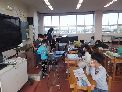 今日は、音楽室で「こぎつね」の合奏の練習をしました。