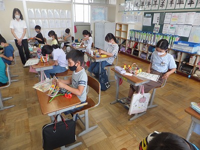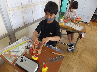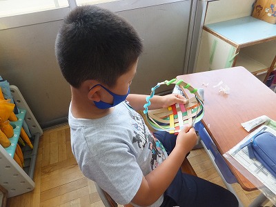 輪ゴムを鳴らすので、いい音とまではいきませんでしたが、自分の作った楽器で嬉しそうに音を出していました。