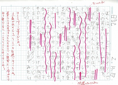 ところで、北京オリンピックのハーフパイプで、平野歩夢選手が金メダルを取った時のことを日記に書いています。何かに感動するってとても大切なことです。感動体験を言葉で表すことは、とても良い学習ですね。