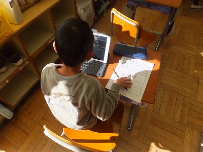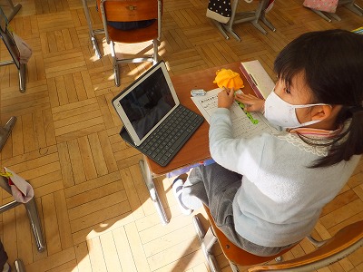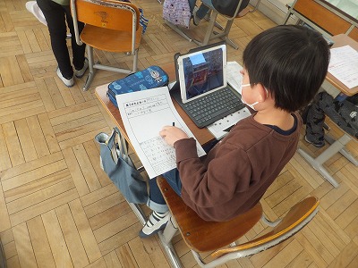 今日は、町探検の時に発見したことを、写真を見ながらカードにまとめました。