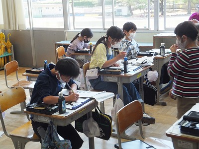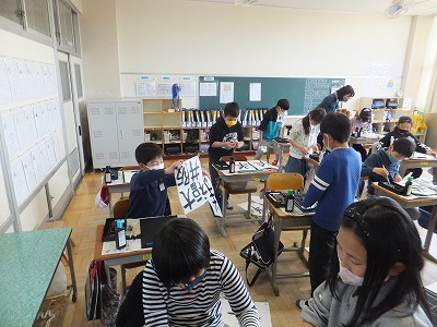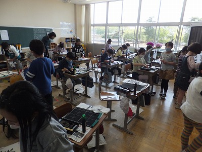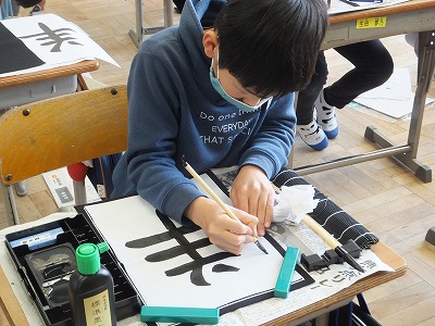提出用の名前を書いています。小筆で書くのが難しいようです。