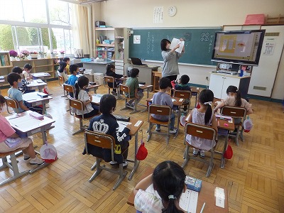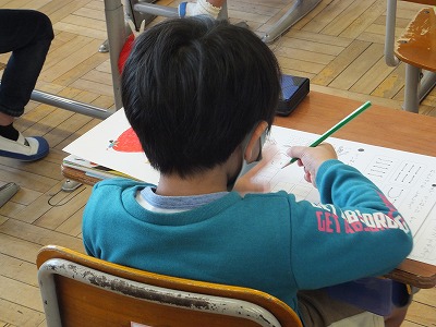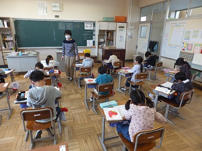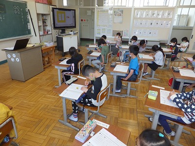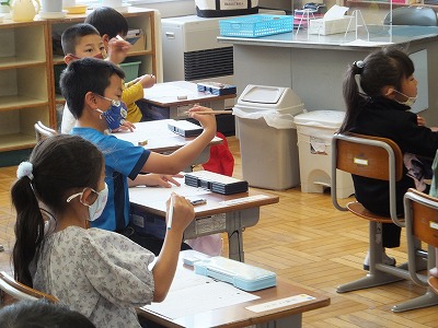 鉛筆の持ち方を確認しています。最初が大切です。正しい持ち方を覚えましょう。