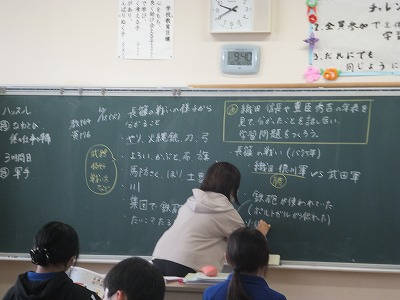 信長・秀吉・家康の年表を見て、わかったことを話し合い、学習問題を作りました。