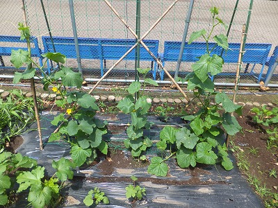 手前は2年生のトウモロコシやキュウリ、ナスなどです。