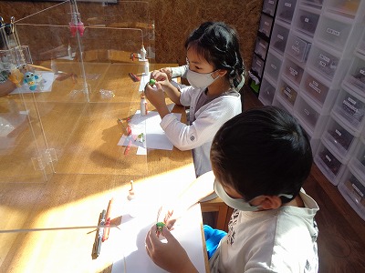 輪ゴムを鳴らすので、いい音とまではいきませんでしたが、自分の作った楽器で嬉しそうに音を出していました。