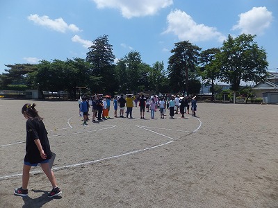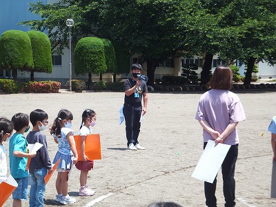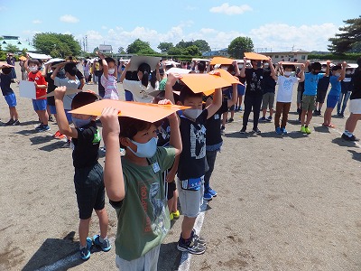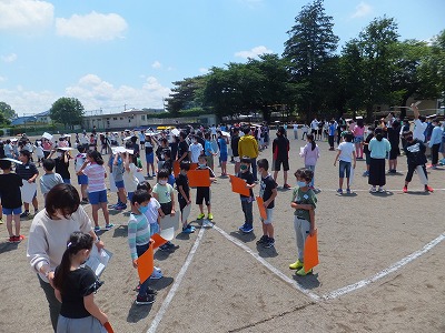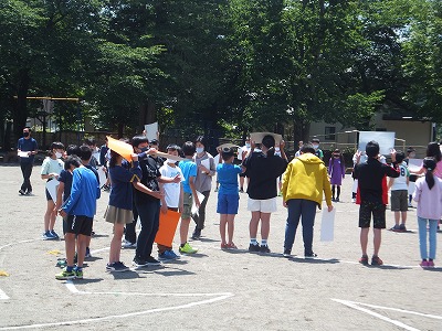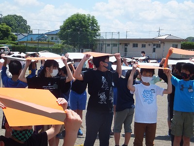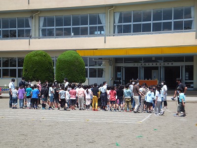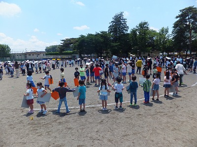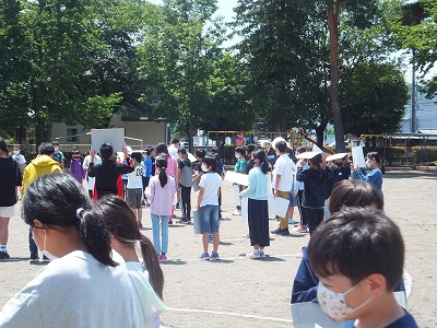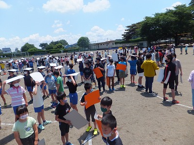 航空写真撮影の後、校舎から全校児童の写真を撮影しました。