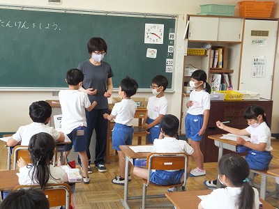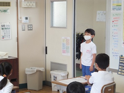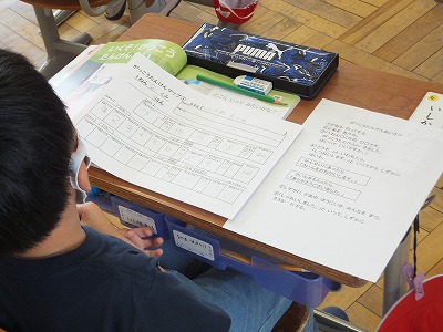 先生からサインをもらう練習です。授業の邪魔にならないように気を付けて、学校探検をしてください。