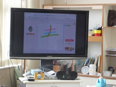 かき方を撮影して、テレビに映しています。