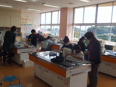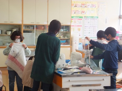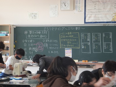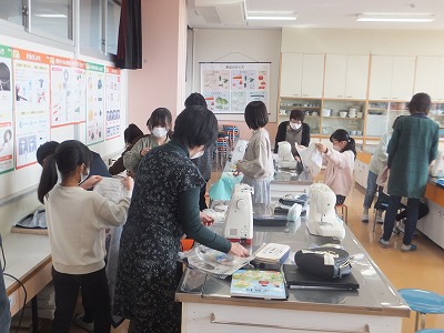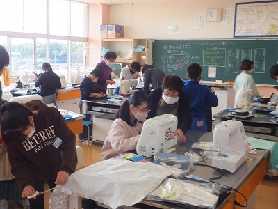 家庭科でミシンを使ってエプロンを縫います。今日は、ボランティアの方々にもお越しいただきました。