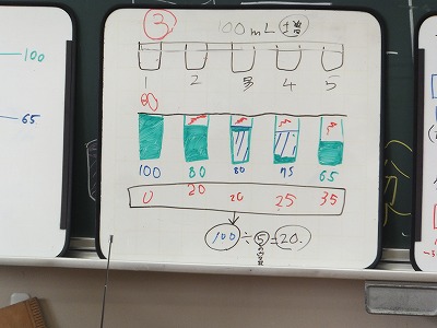 平均は均すこと。100に均すために、・・・・。なかなか面白い発想です。100にするためには、余計に20㎖が必要ということは、平均は・・・・・。