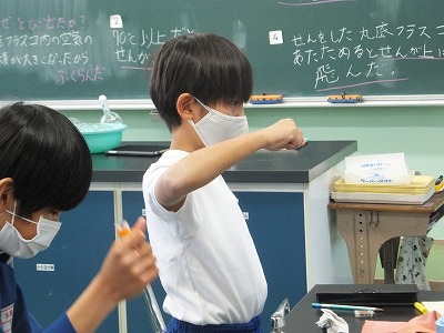 輪ゴムを鳴らすので、いい音とまではいきませんでしたが、自分の作った楽器で嬉しそうに音を出していました。
