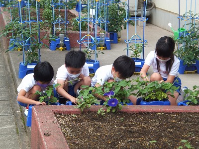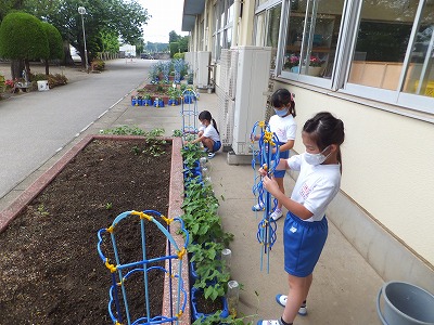 朝顔も順調に育ってつるが出てきたので、支柱を立てました。