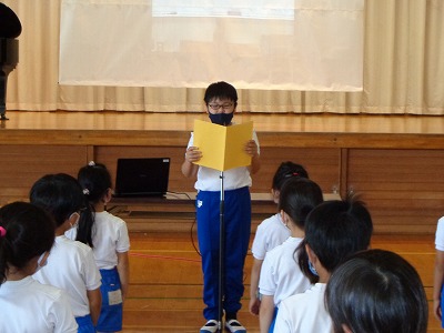 開式のことばのあとに、6年生から児童代表の発表がありました。本北小の良いところが3つあること、本北小を自分たちの力で発展させていきたいことなど、素晴らしい発表でした。