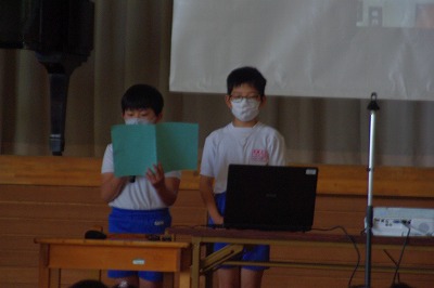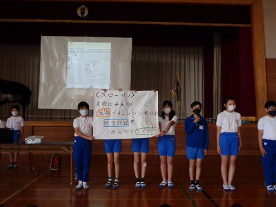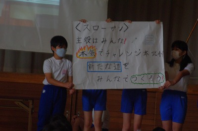 次の児童会のスローガン発表です。どのようにして、このスローガンを決めたか説明のあと発表されました。学校の主役は、言うまでもなく子供たちです。一人一人の子供たちが、本気でチャレンジすることで、新たな本北小が創られていきます。6年生を中心に、新たな道が作られていくことを楽しみにしています。