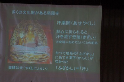 「汗」と書いて「ふざかし」と読むのはなぜか。そして、それは本北小の始まりである培養学舎のあった東汗満願寺の「汗薬師」と関係があること・・・・。
