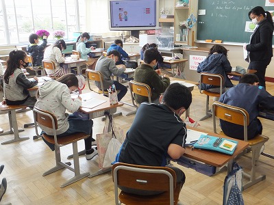友達に好きな果物について質問して、聞き取った答えを教科書に書いていきます。
