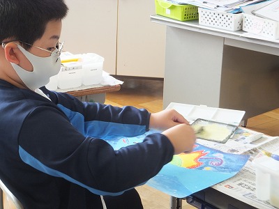 版画もいよいよ刷りに入りました。終わった子は、デザインをやっています。