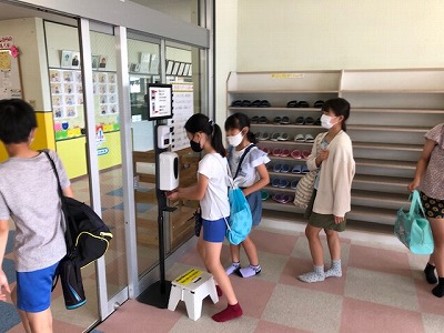 まずは、機械の前で検温し、手をアルコールで消毒します。