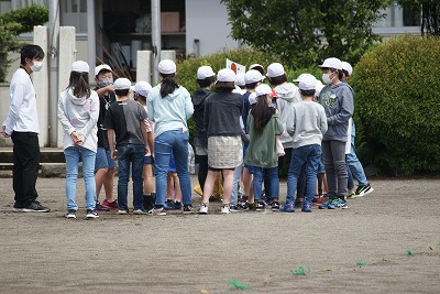 縦割り班ごとに、みずほの自然の森公園でどんな遊びをするかを6年生が下級生に説明しています。