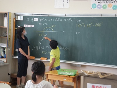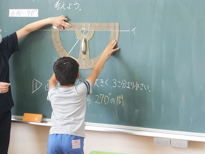 まずは、補助線を引いて、あと何度か分度器で図って、180+・・・・。