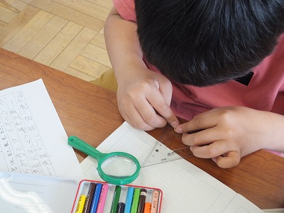 虫めがねを使って、定規で長さも計って。