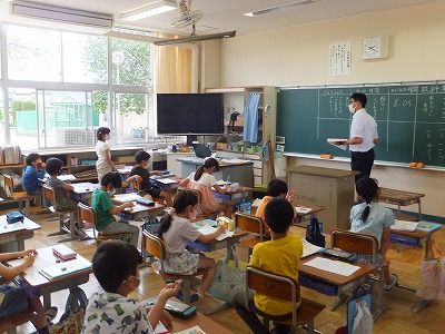 先生が読んでくれたイタリアの学校の様子についての文を、聞き取ってワークシートに書きます。