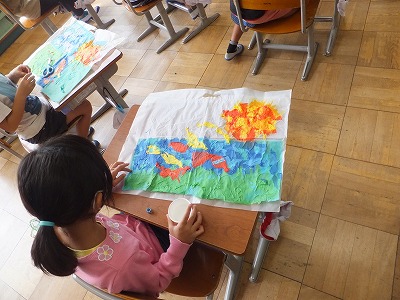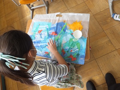 海に魚が泳いでいて、太陽が登っているところを表現しました。