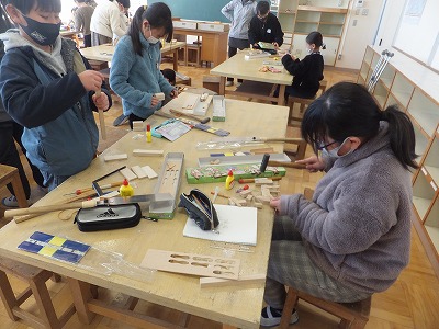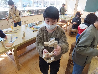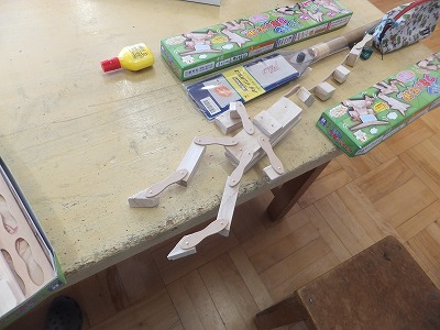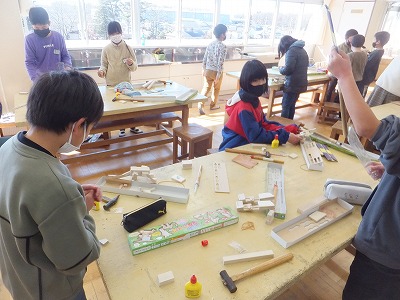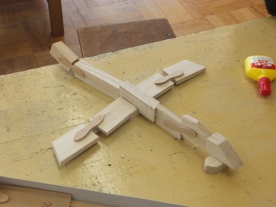 のこぎりで木を切って、くぎでつないで、思い思いの造形を楽しんでいます。