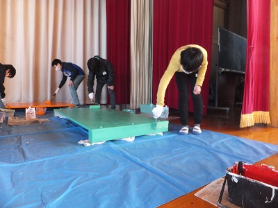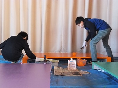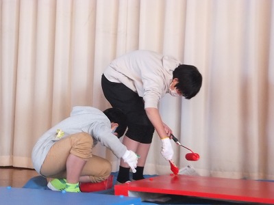 今日は、下塗りが終わったジャンプ台にペンキで色を塗りました。
