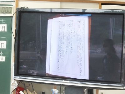 良くまとまっている子のノートをテレビに映して、みんなに見せています。