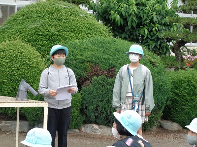 見学に来た3年生には、6年生が説明しています。
