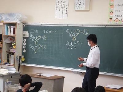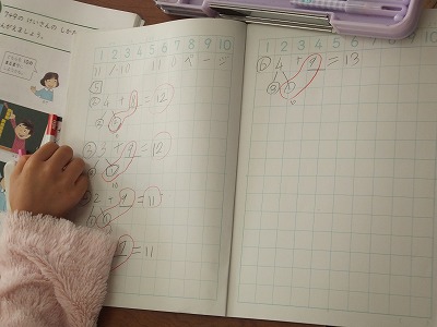 くり上がりのあるたし算の復習をしています。